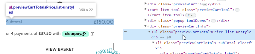 theme.liquidfile and add the standard code snippet. - Find the required selector on the drawer cart.