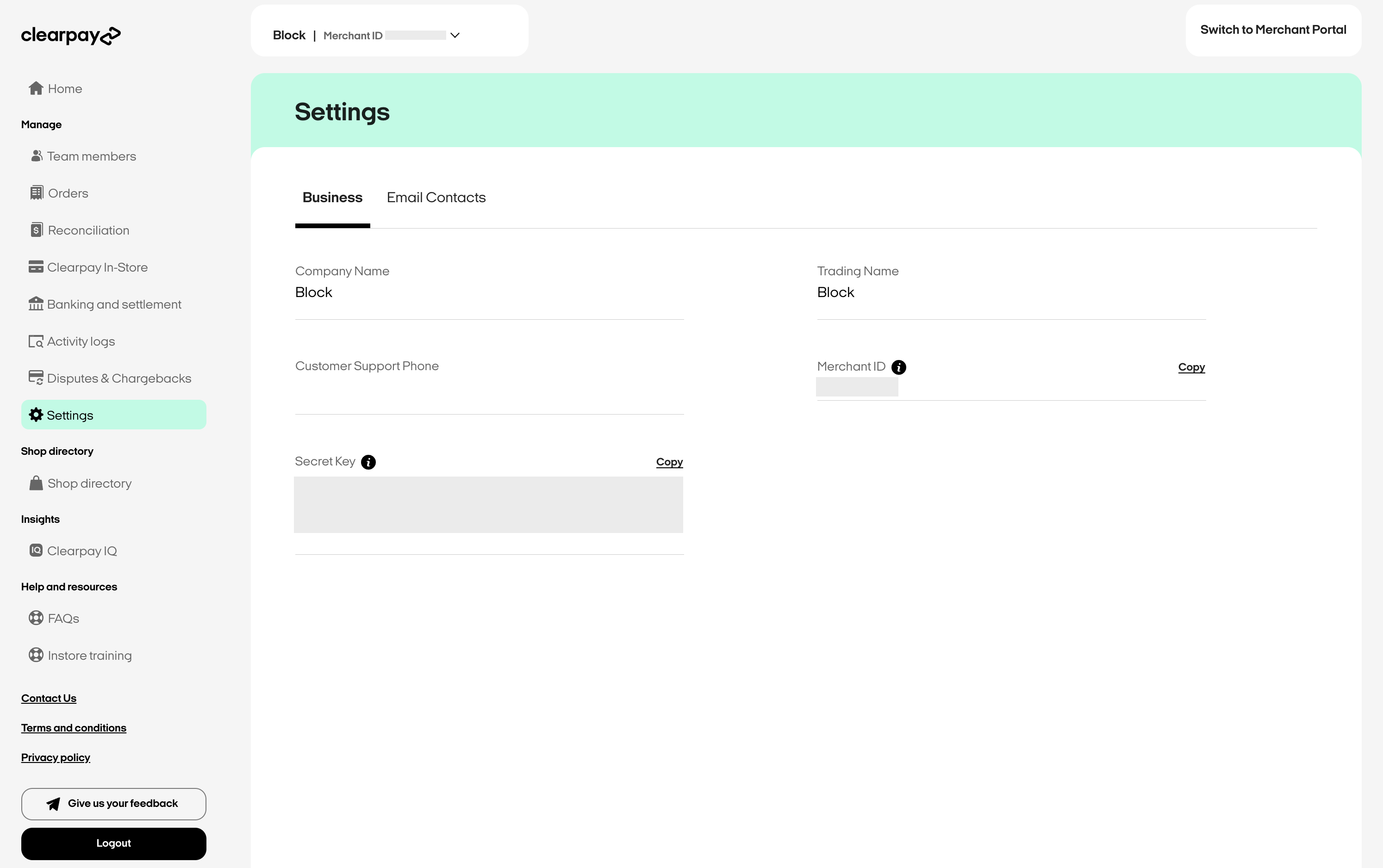 Go to the Settings tab to find all the necessary information. Your direct link to the Settings tab is: https://hub.clearpay.co.uk/settings.