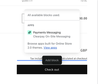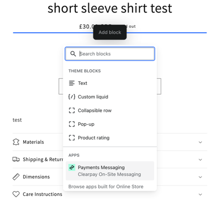 - Click Add block and then select Payments Messaging - Clearpay On-Site Messaging.