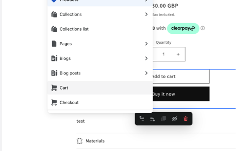 - Next, to open the Cart page, click the dropdown at the top of the editor and click Cart.