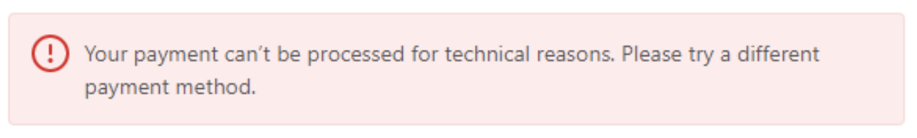 Why am I seeing “Your payment can’t be processed for technical reasons. Please try a different payment method” at checkout?
