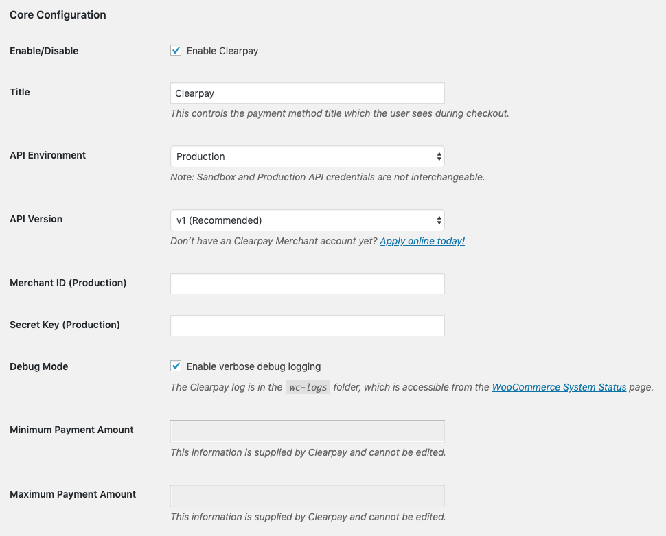 - Enter the Merchant ID provided by Clearpay into the ‘Merchant ID’ field.