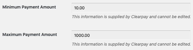 Note: Upon a successful save of the Afterpay credentials, the ‘Minimum Payment Amount’ and ‘Maximum Payment Amount’ values will be updated.