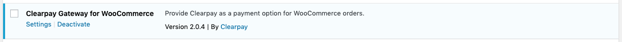 - Locate the ‘Clearpay Gateway for WooCommerce’ in the plugin list and click the ‘Settings’ button.