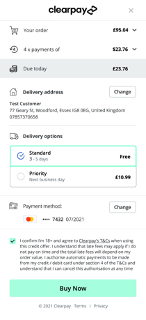 This feature improves the user experience by embedding your shipping options directly into the Clearpay Express Checkout flow. It streamlines the checkout process and can be combined with the buyNow