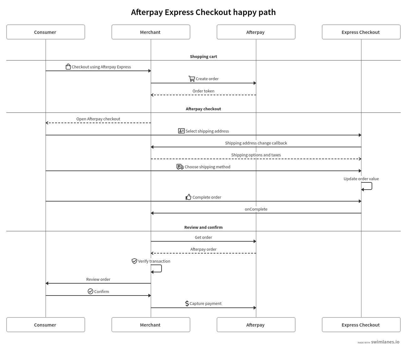 Create CheckoutandAuth(orCapture Full Paymentif using the Immediate Payment Flow) API call payloads - Display the Clearpay Checkout Widget on a review page to enable dynamic updates to the order total after the Express Checkout flow (optional with Integrated Shipping)