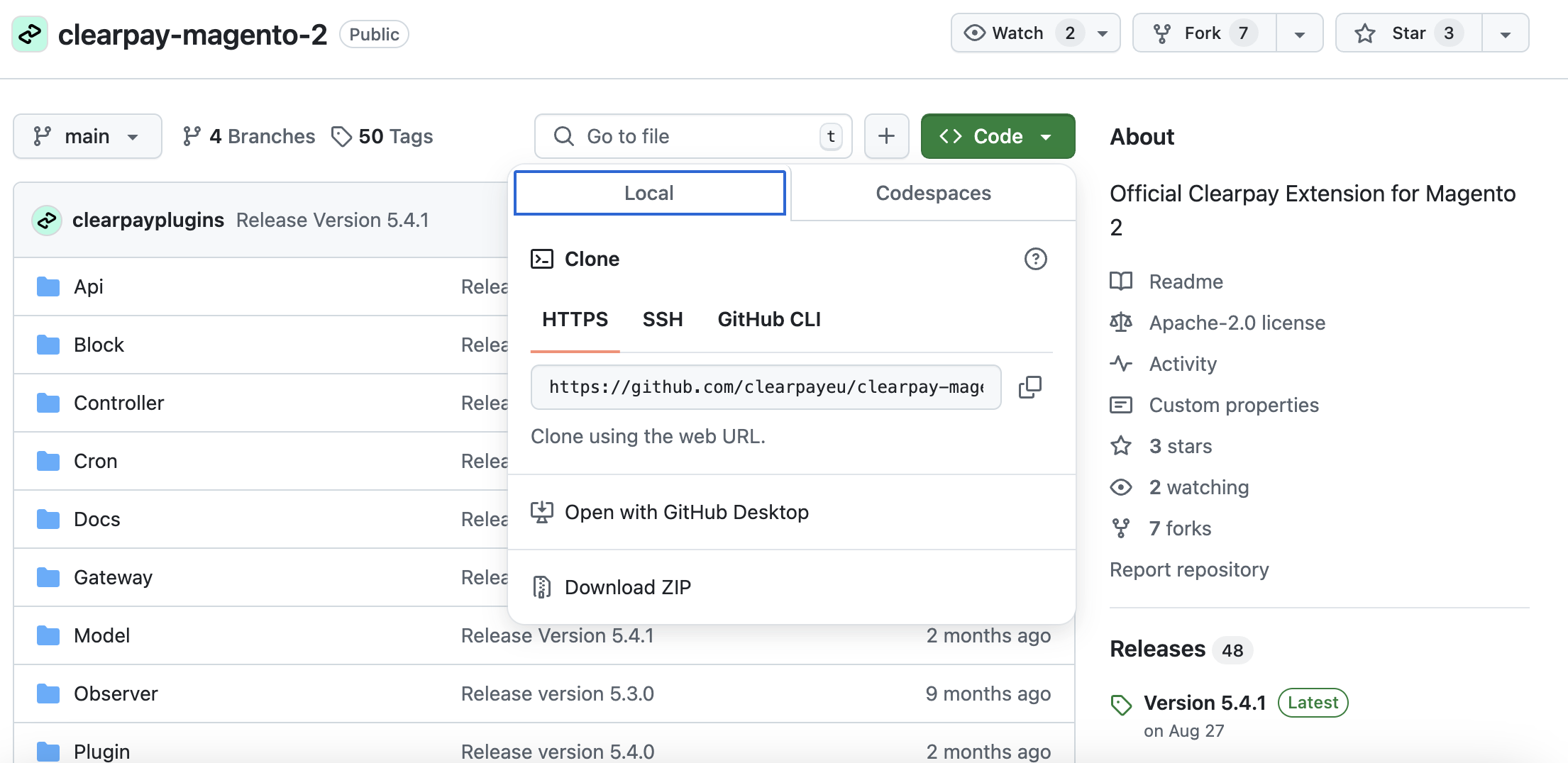 The source code needed depends on your version of Magento. See the Readme file in the Clearpay-Magento-2 part of GitHub.