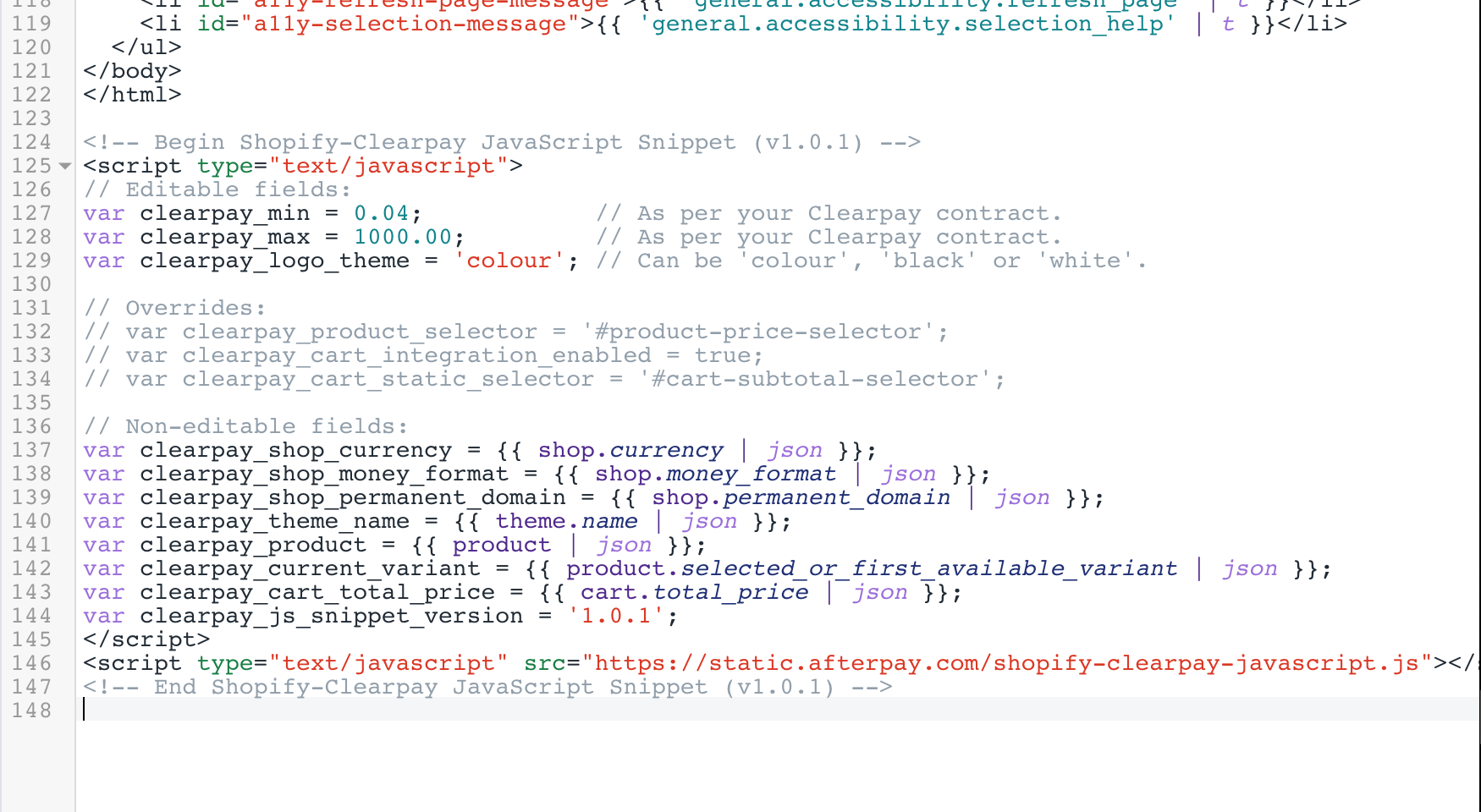 Completing the below steps will position the Clearpay visual assets on the Product and Cart pages of your Shopify website.