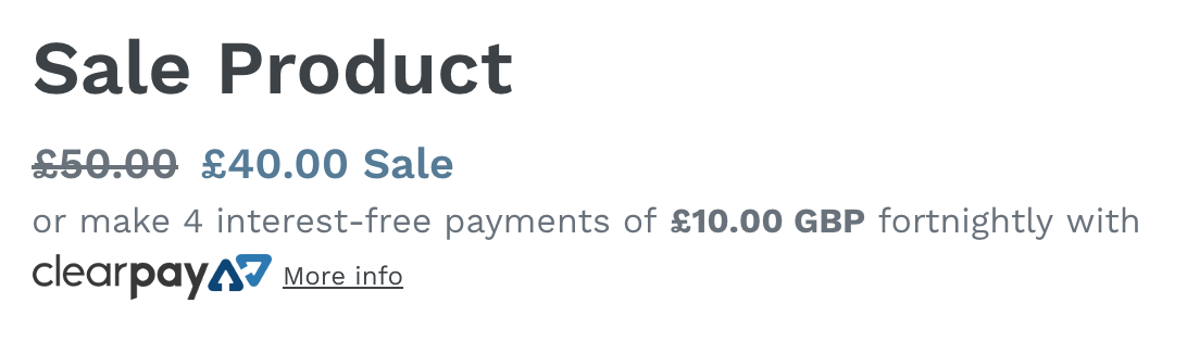 The Clearpay logo and instalment amounts will appear on the Shopify Product Pages. Note: The display may differ depending on site-specific theme and layout.