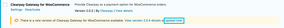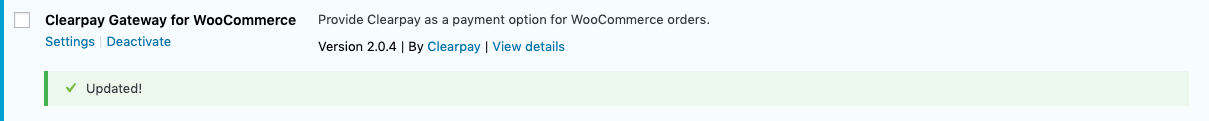 As updates for the ‘Clearpay Gateway for WooCommerce’ plugin are released, a notification will be shown in WordPress Admin.